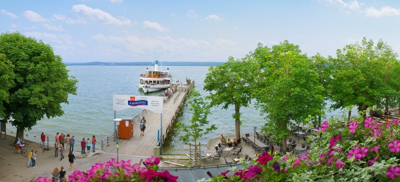 direkt am Ammerseeufer, sonnenverwöhnt und lebendig, unter Kastanien gelegen, Alpenblick und malerische Sonnenuntergänge, längste Seepromenade Deutschlands, musikantenfreundlich, Live-Musik an Sonn- und Feiertagen, Konzerte im Sommer, u.v.m.
